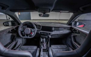 با رفتن به درون کابین این مدل، نصب رولکیج ایمنی بهجای صندلیهای عقب را شاهد هستیم. بهدلیل حذف صندلیهای عقب، ABT دستگیرهی درهای عقب این خودرو را نیز حذف و صندلیهای اسپرتی درون خودرو نصب کرده است که بهخوبی از بدن حمایت میکنند. این صندلیها روکش آلکانترا دارند و از فیبرکربن ساخته شدهاند. باتوجه به تغییرات اعمالشده در آئودی A1 تیونینگشده، بهنظر میرسد قیمتش فراتر از مدل RS3 باشد که چنین مسئلهای چندان توجیه مالی ندارد. بااینحال، تیونر چنین خودرویی تولید کرده است تا توانایی خود در تولید خودروهای هاچبک اسپرت را در دنیای شاسیبلندپسند امروز نشان دهد.