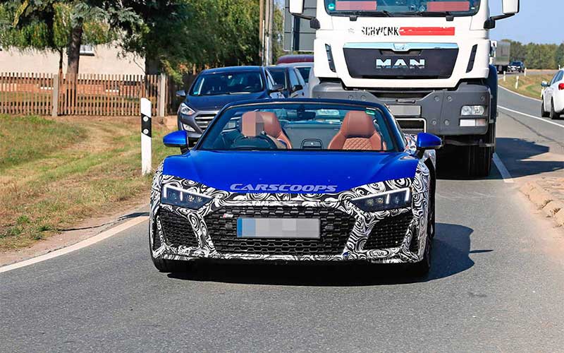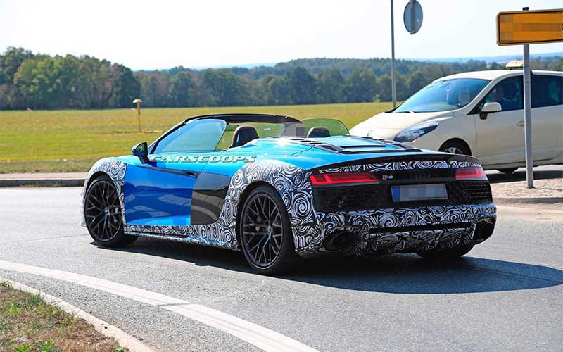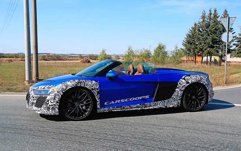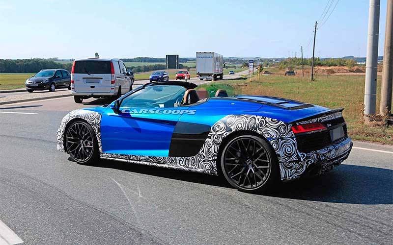 آئودی از اوایل سال جاری تستهای جادهای R8 فیس لیفت را شروع کرده اما این اولین بار است که مدل روباز این خودروی اسپورت رؤیت شده است.