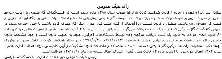 موضوع با اعلام نظر هیئت تخصصی اقتصادی، مالی و اصناف دیوان عدالت اداری مبنی بر اینکه بر مبنای بند ب و تبصره یک ماده ۱ قانون هدفمند کردن یارانه ها قیمت گذاری گاز طبیعی با رعایت شرایط مندرج در مقررات مزبور بر عهده دولت بوده و مجوزی برای اخذ آبونمان گاز طبیعی پیش بینی نشده است، در دستور کار هیئت عمومی قرار گرفت و در هیئت عمومی بخشنامه مورد شکایت بر اساس ماده ۴ قانون تنظیم بخشی از مقررات مالی دولت و ماده ۶۰ قانون الحاق موادی به قانون یاد شده که دریافت هرگونه وجهی را توسط دستگاههای اجرایی منوط به رعایت مقررات قانونی کرده است، خلاف قانون تشخیص داده شد و ابطال شد.