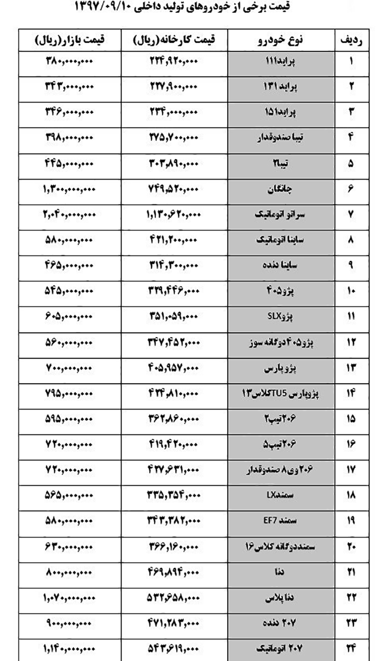 قیمت خودروهای داخلی در بازار امروز ۱۳۹۷/۰۹/۱۰ به شرح زیراست: