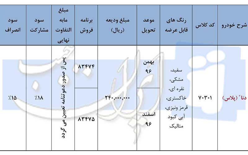 به اطلاع کلیه متقاضیان محترم محصولات ایران خودرو می رساند، شرکت ایران خودرو پیش فروش دنا پلاس ویژه مھر ماه ۹۶ را از روز چھارشنبه ۹۶/۰۷/۲۶ تا زمان تکمیل ظرفیت، به شرح جدول ذیل ارائه می‌نماید: