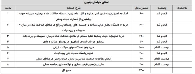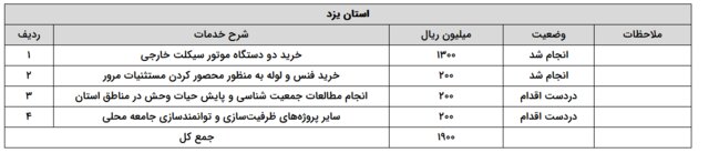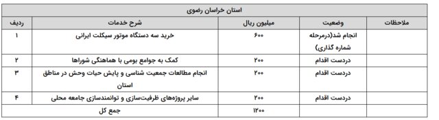 به گزارش ایسنا، در فاز نخست هزینهکرد این عوائد، با توجه نیازسنجی اولیه از استانها، برنامههایی در حاشیه زیستگاههای هدف این استانها آغاز شد. بر این اساس تاکنون در استان خراسان جنوبی ۳ میلیارد و ۲۰۰ میلیون ریال، در استان خراسان رضوی یک میلیارد و ۲۰۰ میلیون ریال، در استان یزد یک میلیارد و ۹۰۰ میلیون ریال و در استان کرمان یک میلیارد ریال از محل این عوائد هزینه شده است که محل هزینهکرد آنها بهطور مشخص در جدولهای زیر قابل مشاهده است. شایان ذکر است که مابقی عوائد نیز با توجه به اعلام نیاز استانها، در دست برنامهریزی و اقدام است که تا پایان سال جاری صرف شود.