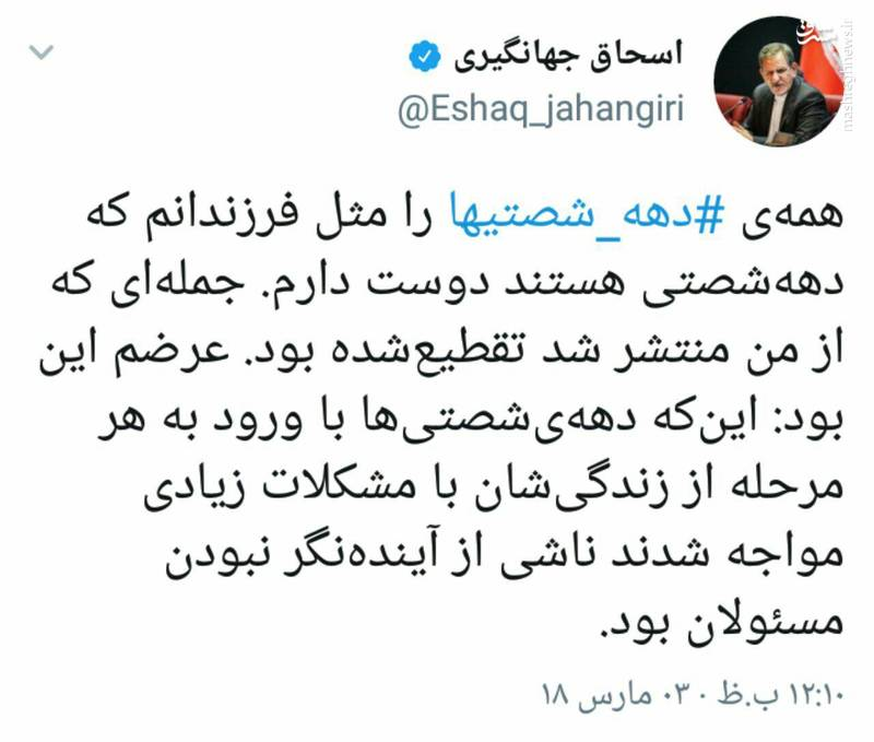 به گزارش «تابناک»، پاسخ جهانگیری به این سوال، تقطیع سخنانش است. یعنی پیش و پس از آن سخنان در خصوص معضل دهه شصتیها، وی جملاتی بیان کرده که حکایت از توجهاش به مشکلات این نسل و ضرورت تدبیر آنهاست. اینکه مسئولان آینده نگر نبودهاند و در نتیجه این نقصان، این نسل با مشکلات بزرگی مواجه شدهاند.