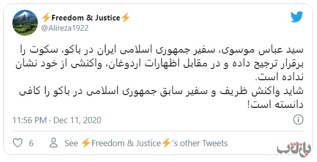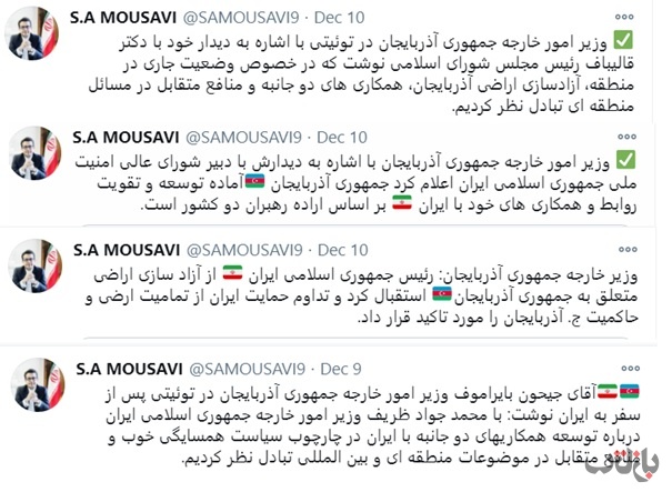 در پایان به چند توئیت اخیر سفیر ایران در جمهوری آذربایجان که صرفاً ترجمه ای از گفته های وزیر امور خارجه این کشور است، در قالب تصویر اشاره می شود: