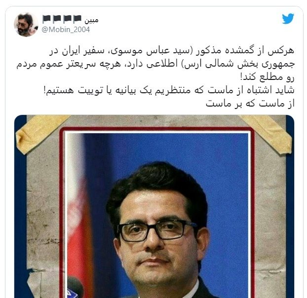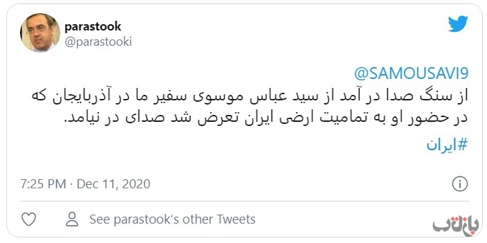 سخن از «سید عباس موسوی»، سخنگوی سابق وزارت امور خارجه و سفیر فعلی ایران در کشور آذربایجان است که در صفحه مجازی خود در توئیتر تقریباً به یک مترجم و خبرنگار وزیر امور خارجه جمهوری آذربایجان تبدیل شده و عمدتاً به انعکاس مواضع و سخنان امثال او اکتفا می کند!