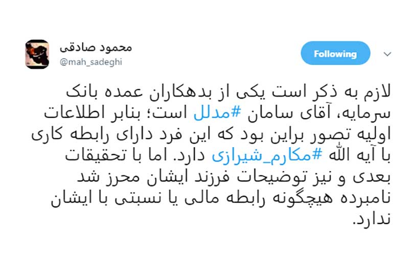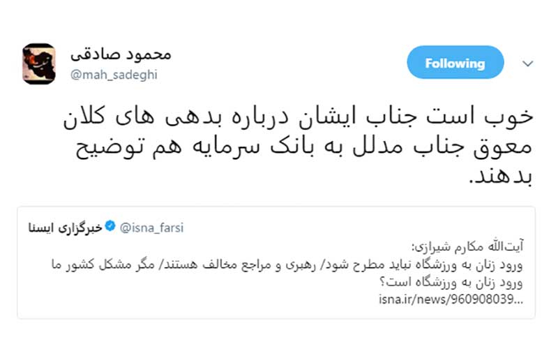 به گزارش تابناک، هفته گذشته و پس از سخنان آیتالله مکارم شیرازی درباره اینکه اساسا نباید موضوع حضور بانوان در ورزشگاهها مطرح شود، واکنشهای فراوانی به آن در شبکههای اجتماعی صورت گرفت. از جمله آنها توئیت مهم و افشاگرانه محمود صادقی بود که بیارتباط به موضوع زنان و ورزشگاه با ریتوئیت خبر سخنان آیتالله مکارم شیرازی نوشته بود: «خوب است جناب ایشان درباره بدهیهای معوق جناب مدلل به بانک سرمایه هم توضیح بدهند». اظهارنظر مهمی که میتوانست سرنخ بسیاری از جریانهای فساد اقتصادی را برملا کند.