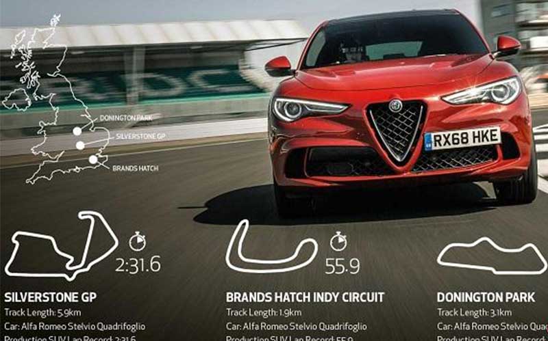 اولین پیست اتومبیلرانی که خودروی آلفارومئو استلویو Quadrifoglio موفق به ثبت رکورد در آن شده است، پیست Indy Circuit Brands Hatch واقع در جنوب شرق انگلستان بوده است که با ثبت زمان تنها ۵۵.۹ ثانیه موفق شده خود را سریع ترین خودروی شاسی بلند این پیست معرفی کند.