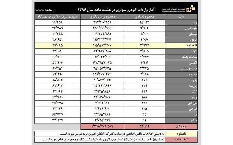 به گزارش پردیس خودرو در این لیست برند رنو بیشترین وارد را بخود اختصاص داده و پس از آن هیوندای و نیسان در رده ها بعدی قرار گرفته اند.در بین برند های وارد شده خودروی های گک هم وجود دارد که پیش از این مجوز آن در اختیار گرامی ها بوده است اما مشخص نیست تعداد ۲۲۴ دستگاه خودروی وارد شده با همان مجوز وارد شد یا شرکتی جدید اقدام به واردات این برند نموده است.
