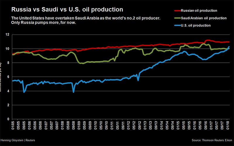 اداره اطلاعات انرژی آمریکا اوایل ماه جاری میلادی اعلام کرد تولید نفت این کشور تا اواخر سال ۲۰۱۸ به ۱۱ میلیون بشکه در روز افزایش می‌یابد. این در حالیست که روسیه کمتر از ۱۱ میلیون بشکه نفت تولید می‌کند و همین موضوع باعث پیشی گرفتن آمریکا از مسکو می‌شود.