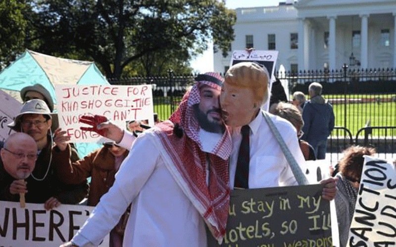 صورتکهای ترامپ، محمد بن سلمان و خاشقجی در تظاهرات اعتراضی مخالفان ترامپ در برابر کاخ سفید علیه روابط او و رهبری سعودی