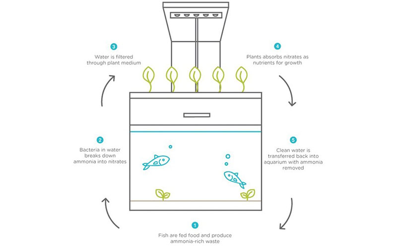 غلظت آمونیاک فضله ای که ماهی تولید می کند، بسیار زیاد است. این آمونیاک به وسیله باکتری موجود در آب به نیترات تبدیل می شود و به وسیله گیاهان فیلتر می شود. به عبارت دیگر گیاهان نیترات را به عنوان سوخت جذب می کنند. در این میان آب بدون آمونیاک و کاملا شفاف به تانک آکواریوم برمی گردد. آکواریوم جدید گنجایش ۱۱.۳۵ لیتر آب دارد.