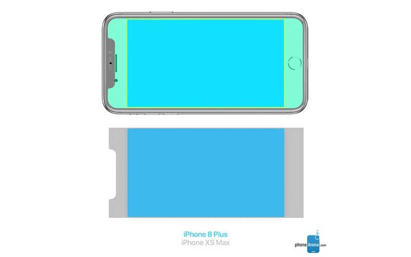 ما می‌دانیم که پرچمدار ۲۰۱۸ اپل با نمایشگری ۶.۵ اینچی و نسبت ۱۹.۵:۹ (بدون در نظر گرفتن گوشه‌های گرد) تولید می‌شود. با در نظر گرفتن نسبت صفحه یکسان آیفون ایکس اس مکس و آیفون ۱۰، ما می‌توانیم ابعاد مدل سال گذشته را با همان نسبت، تا ۶.۵ اینچ بزرگ کنیم. این کار باعث می‌شود ما به یک نتیجه جالب برسیم: دستگاه مورد نظر حالا بزرگتر از آیفون ۸ پلاس است. قطعا با اطمینان نمی‌توان گفت که نمایشگر بزرگتر، چند میلی‌متر به حاشیه‌های فریم نسل جدید اضافه خواهد کرد یا نه، اما این آزمایش به ما اجازه می‌دهد که اندازه صفحه نمایش هر دو گوشی را با یکدیگر مقایسه کنیم.