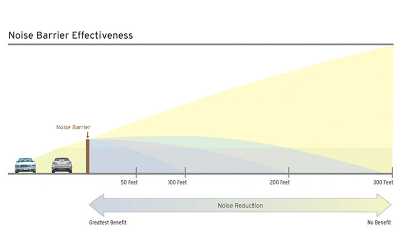 کسانی که در ارتفاعات تپه‌ای شکل یا نزدیکی شاهراه‌های اصلی زندگی می‌کنند، حتی گاهی اوقات متوجه می‌شوند که با وجود نصب دیوار جاذب صدا، نویز صوتی بسیار آزاردهنده‌تر از آن است که بتوانند تحمل کنند. در خروجی یکی از بزرگراه‌های حومه‌ی شهر نیواورلئان، دیوار جاذب صوتی در مسیر یکپارچه نبود. ساکنین آن منطقه اصلا نمی‌توانستند نویز صوتی محیط را تحمل کنند. حتی شهروندای که در فاصله‌ی ۱۵۲.۴ متری دیوار ساکن بودند از سروصدای اتومبیل‌ها در امان نبودند. به دلیل شرایط عبور و مرور دو دیوار صوتی به موازات هم طراحی شده بود ولی نویز از دیوار اول به دوم منتقل می‌شد و در نهایت آسایش شهروندان را گرفته بود.