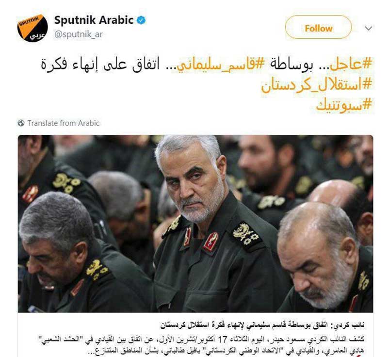 اسپوتنیک عربی ادعا کرد با میانجیگری قاسم سلیمانی توافق شد تا به طرح جدایی اقلیم کردستان خاتمه داده شود.