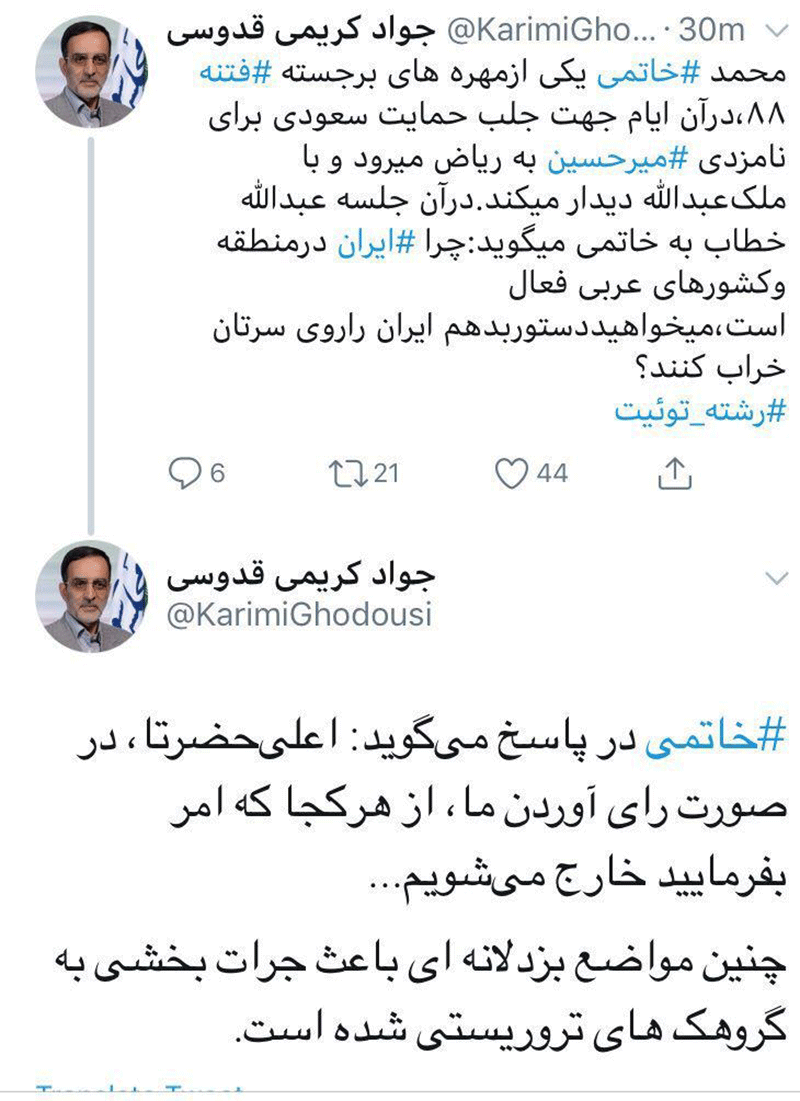 جواد کریمیقدوسی که ادعاهایش معمولا توسط افراد و سازمانها و وزارتخانههایی که وی مطرح میکند، مورد تکذیب قرار میگیرد، این بار توییتی را علیه سیدمحمد خاتمی منتشر کرد.