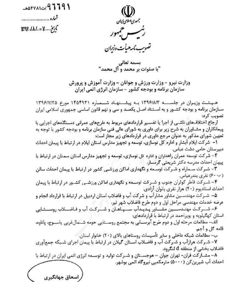 بر اساس مصوبه هیئت وزیران، اختلافهای ناشی از اجرا یا تفسیر قراردادهای مربوط به طرحهای عمرانی ۸ شرکت به سازمان برنامه و بودجه ارجاع شد.