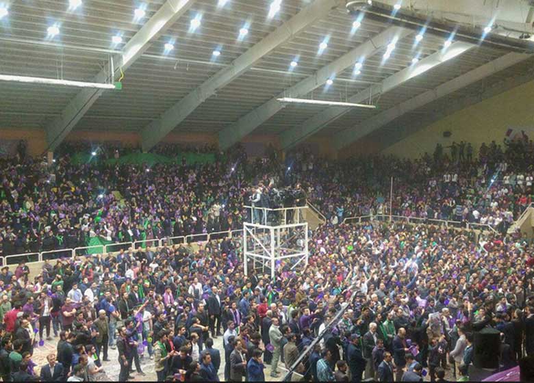 حجت الاسلام والمسلمین حسن روحانی در حالی در سالن تختی اردبیل سخنرانی میکند که گنجایش این مجموعه از ساعتی پیش تکمیل شده و مملو از جمعیت است.