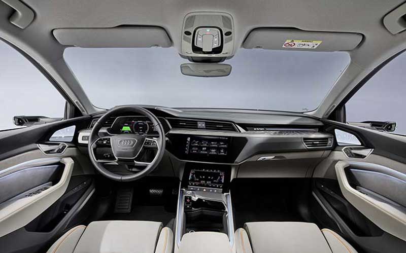 مسئولان آئودی میگویند برای دستیابی به بیشترین بازده ممکن، در اکثر شرایط رانندگی فقط موتور الکتریکی عقب استفاده میشود؛ ولی درصورت نیاز، موتور برقی جلو نیز فعال خواهد شد. نسخهی پایه آئودی ای-ترون از سیستم تعلیق بادی برای اطمینان از پایداری و فرمانپذیری بهتر بهره میبرد. همچنین، امکان بهرهگیری از اتصال به سیستم شارژ آئودی با قابلیتهای هوشمند، مانند شارژ خودرو الکتریکی در ساعتهای خارج از مصرف اوج برق برای مصارف خانگی، ارائه میشود.
