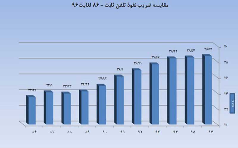 بررسی ها نشان می دهد که ضریب نفوذ تلفن ثابت در کشور طی ۱۰ سال گذشته از ۳۳.۴۹ درصد به ۳۸.۷۱ درصد رسیده است.