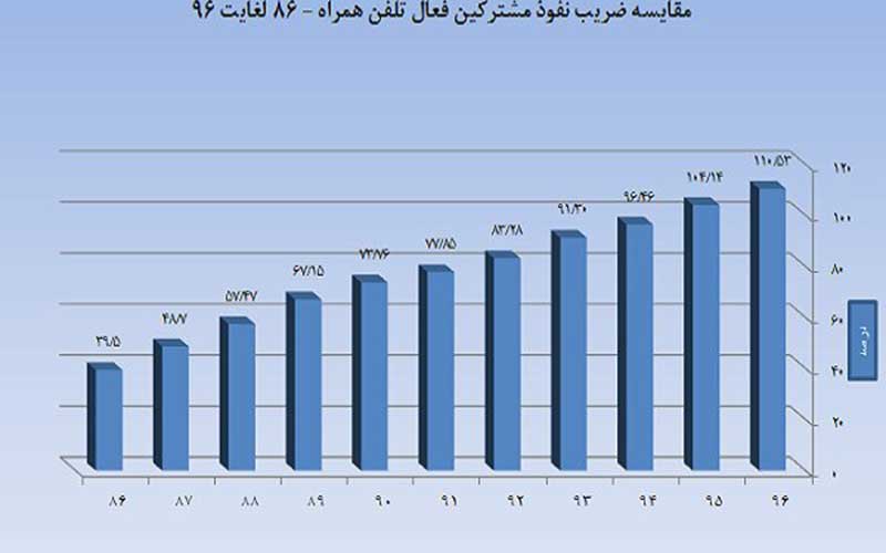 مقایسه ضریب نفوذ مشترکان فعال تلفن همراه نیز حاکی از آن است که در سال ۸۶ ضریب نفوذ موبایل در ایران ۳۹.۵ درصد بود و طی ۱۰ سال اخیر به ۱۱۰/۵۳ درصد رسیده است.