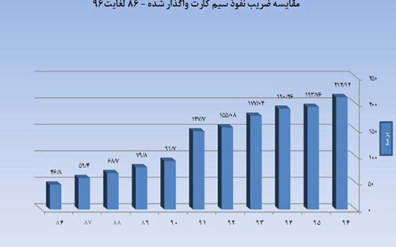 برآوردها نشان می دهد که ضریب نفوذ سیم کارت واگذار شده در کشور نیز از سال ۸۶ که ۴۶.۸ درصد بوده به ۲۱۲.۱۲ درصد رسیده و رشد بیش از ۵ برابری را نشان می دهد.