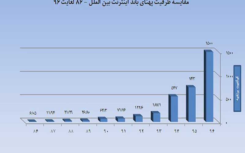 مقایسه ظرفیت پهنای باند اینترنت بین الملل نیز طی ۱۰ سال گذشته نشان می دهد که در سال ۸۶ ظرفیت پهنای باند بین الملل ۶.۰۵ گیگابیت برثانیه بوده که هم اکنون با رشد قابل توجهی به ۱۵۰۰ گیگابیت برثانیه رسیده است.