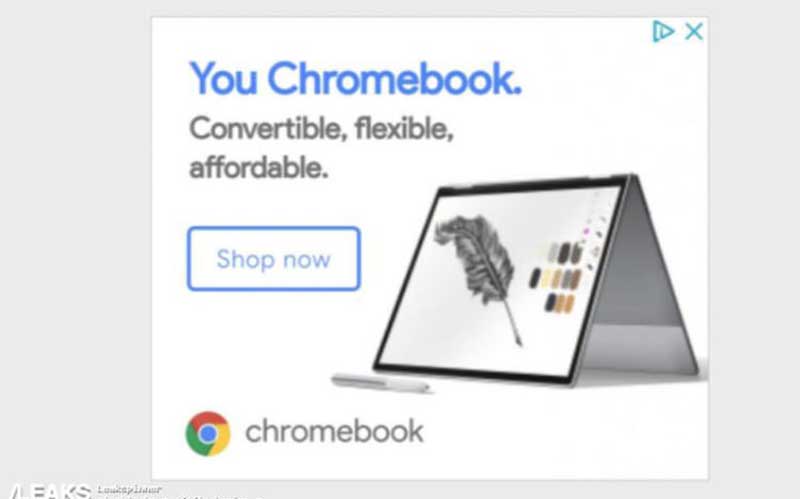 یک‌ماه مانده به موعد رونمایی، تصویری از Pixelbook جدید گوگل و گوشی هوشمند پیکسل ۳ ایکس ال، در قالب مربوط به آگهی تبلیغاتی این دو محصول، توسط SlashLeaks به‌اشتراک گذاشته‌ شده است. این آگهی نشان می‌دهد پیکسل‌بوک جدید گوگل دارای حاشیه‌های باریک و طراحی زیبایی است. آگهی دیگر تایید می‌کند که پیکسل‌بوک،‌ قابلیت تبدیل‌شدن از لپتاپ به تبلت را خواهد داشت.