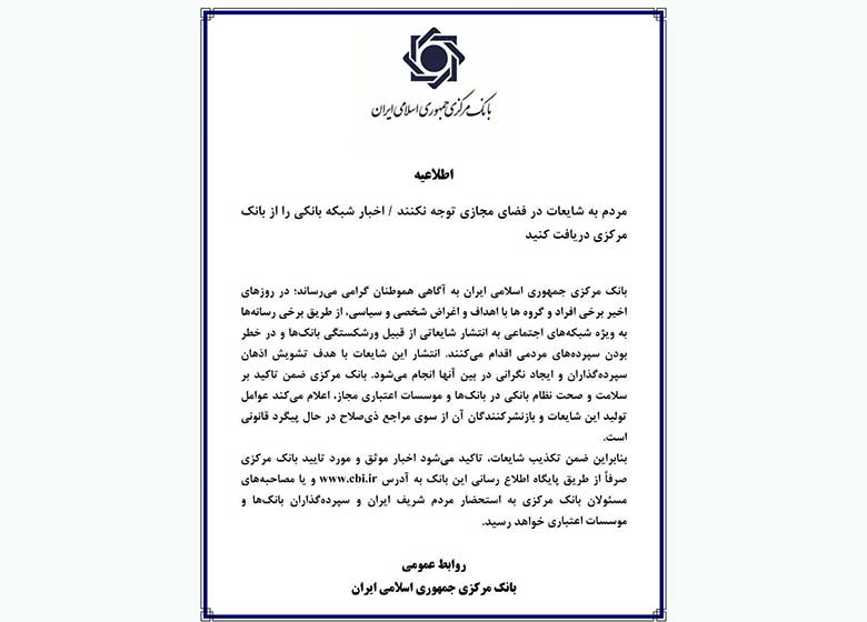 بانک مرکزی جمهوری اسلامی ایران به آگاهی هموطنان گرامی می رساند؛ در روزهای اخیر برخی افراد و گروه ها با اهداف و اغراض شخصی و سیاسی، از طریق برخی رسانه ها به ویژه شبکه های اجتماعی به انتشار شایعاتی از قبیل ورشکستگی بانک ها و در خطر بودن سپرده های مردمی اقدام می کنند.