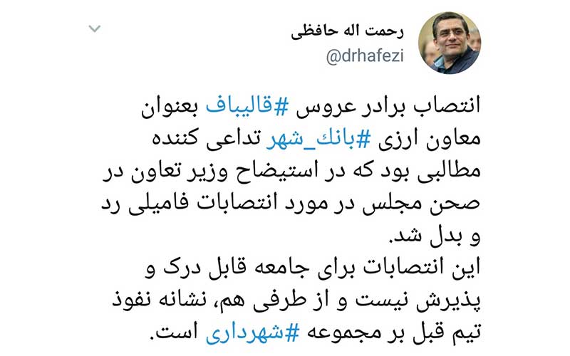 اعتراض تند حافظی به انتصاب نزدیکان قالیباف و محسن رضایی در بانک شهر