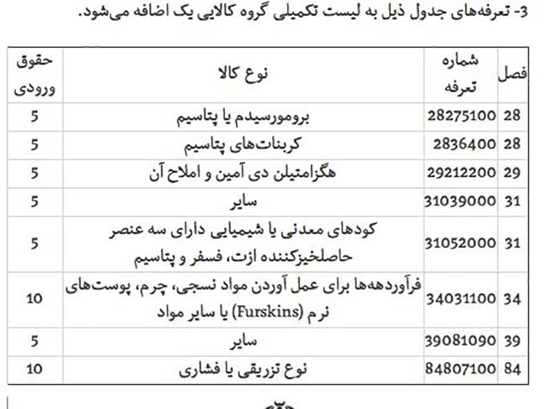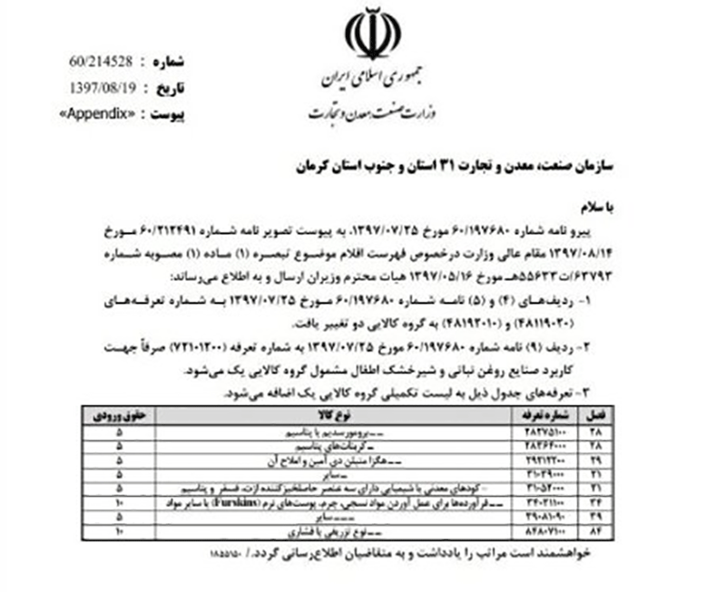۱- ردیفهای ۴ و ۵ نامه شماره ۱۹۷۶۸۰/۶۰ مورخ ۱۳۹۷/۷/۲۵ به شماره تعرفههای (۴۸۱۱۹۰۲۰) و (۴۸۱۹۲۰۱۰) به گروه کالایی دو تغییر یافت.