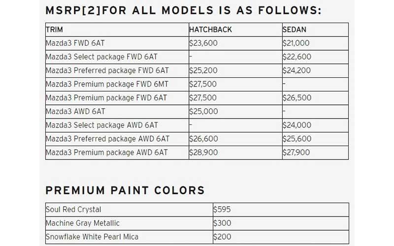 مزدا ۳ سدان قیمت پایهی ۲۱۸۹۵ دلاری داشته و بهصورت استاندارد با تجهیزاتی همچون رینگهای ۱۶ اینچی آلیاژی، صندلیهای پارچهای، چراغهای LED، ورود بدون کلید و صفحهنمایش ۸.۸ اینچی عرضه میشود.