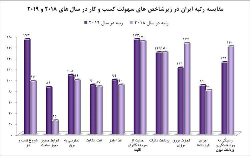 ایران در زیرشاخصهای شروع کسبوکار، حمایت از سرمایهگذاران و پرداخت مالیات عملکرد بسیار ضعیفی را از خود نشان داده است اما در زیرشاخصهای دیگری مانند شرایط صدور مجوز ساختوساز، اخذ اعتبار و اجرای قراردادها رتبهای در حد متوسط کسب کرده است.