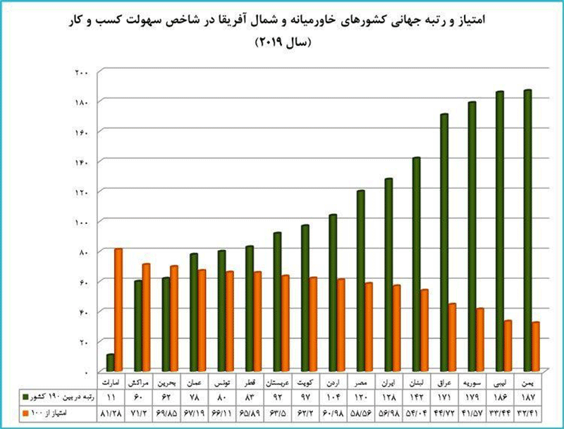 امتیاز و رتبه جهانی کشورهای خاورمیانه و شما آفریقا در شاخص سهولت کسب و کار نیز در جدول زیر آمده است: