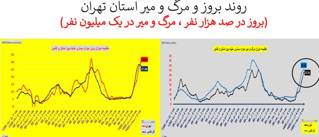 به گفته وزارت بهداشتی ها در ۱۰ استان به اوج کووید-۱۹ رسیده ایم و ۶ استان نیز هنوز نشانی از روند نزولی ندارند. در عین حال در هفته اخیر در تهران نسبت به هفته ماقبل، افزایش ۴۰.۵ درصدی تعداد موارد مرگ و میر ناشی از بیماری را شاهد بوده ایم.
