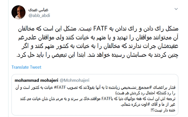 عباس عبدی نیز در همین باره توییت کرد: مشکل رای دادن و رای ندادن به FATF نیست. مشکل این است که مخالفان آن می‌توانند موافقان را تهدید و یا متهم به خیانت کنند ولی موافقان علی‌رغم عقیده‌شان جرات ندارند که مخالفان را به خیانت به کشور متهم کنند و اگر چنین کردند به حسابشان رسیده خواهد شد. ابتدا این تبعیض را باید حل کرد.