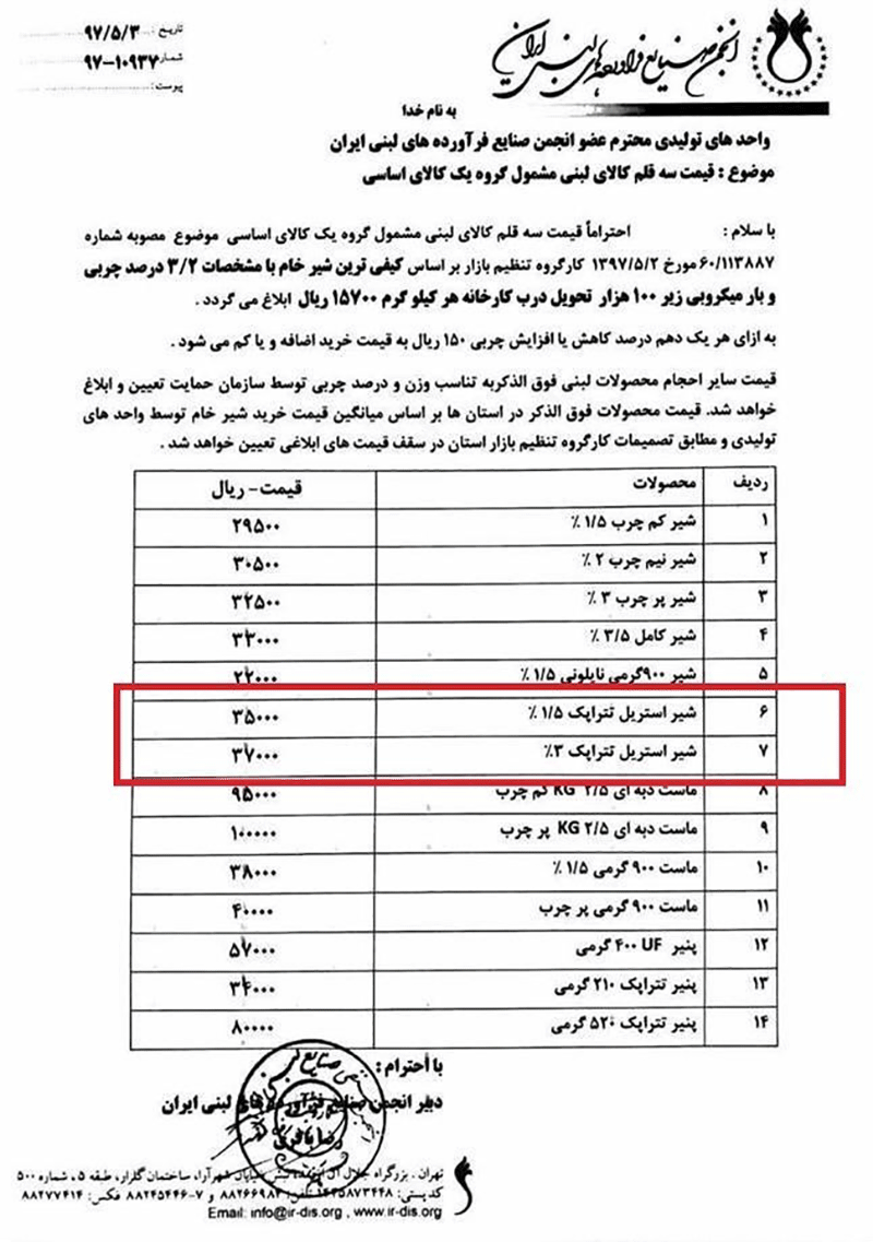 بنابراین گزارش صنایع لبنی قیمت محصولات خود را در سال جاری چند مرتبه افزایش داده اند به طوری که در تاریخ ۹۷/۵/۳ قیمت هر لیتر شیر با بسته بندی مدت دار پرچرب بعد از یک بار افزایش قانونی ۳۷۰۰ تومان و شیر کم چرب ۳۵۰۰ تومان اعلام شده بود که دوباره قیمت های جدید این محصولات در بازار افزایش یافته است و قیمت ۵۰۰۰ تومان به فروش میرسد و ۴۲ درصد افزایش قیمت دارد.