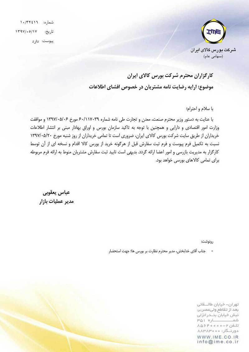 در جدید ترین دور افشاگری‌ها بورس کالای ایران در نامه‌ای خطاب به کارگزاران اعلام کرده از شنبه بیستم مرداد ماه هرگونه ثبت سفارش خرید منوط به امضای فرمی از سوی خریدار است که نسبت به اعلام عمومی هویت خود ابرار رضایت کرده است!