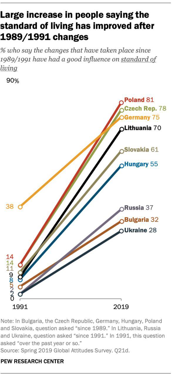 ۳۰ سال پس از سقوط کمونیسم، بهطور واضحی تعداد (درصد) افرادی که میگویند تغییرات این سی سال منجر به بهبود استانداردهای زندگی در کشورشان شده، افزایشیافته است. آنها متقاعد شدهاند که تغییرات، از آموزش گرفته تا غرور ملی، تأثیر خوبی بر کشورشان داشته است. بیش از نیمی از جمعیت بعضی از این کشورها چنین نظری دارند، اما کمتر از ۴۰% جمعیت افراد در سه کشور روسیه، بلغارستان و اوکراین چنین نظری دارند. اوکراینیها و روسها البته در ابتدا (۱۹۹۱) هم مطلقاً به تغییرات خوشبین نبودند.