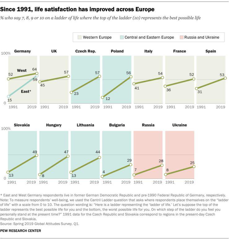 در کشورهای موردبررسی، رضایت از زندگی مردم از ۱۹۹۱ تاکنون افزایشیافته است؛ مثلاً درحالیکه در ۱۹۹۱ تنها ۱۲% مردم در لهستان رضایت از زندگی خود را روی مقیاس ۱ تا ۱۰، به میزان ۷ یا بالاتر ارزیابی کرده بودند، امروز ۵۶% مردم لهستان چنین ارزیابیای دارند. افزایش رضایت از زندگی در آلمان شرقی سابق هم فاحش بوده است، اما شیب افزایش در آلمان غربی سابق تا این حد نبوده است. در مقام مقایسه با کشورهای اروپای غربی، طی سی سال گذشته، «شیب» افزایش رضایت از زندگی در بریتانیا و فرانسه هم کمتر از کشورهای بلوک شرق بوده است.