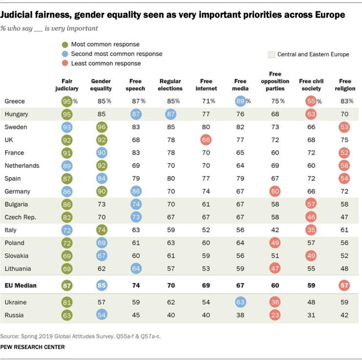 اغلب ساکنان ۱۴ کشور اتحادیه اروپا میگویند این سه ویژگی لیبرال دموکراسی در کشورشان بسیار مهم است؛ اما شدت حمایت از وجوه دیگر دموکراسی، نظیر آزادی مذهبی و جامعه مدنی، کمتر است. این حمایت عموماً در اروپای غربی بیش از اروپای مرکزی و شرقی است. روسها و اوکراینیها از دستگاه قضایی عادلانه و برابری جنسیتی حمایت میکنند، اما کمتر حامی داشتن احزاب مخالفی که آزادانه فعالیت کنند هستند. کمترین حمایت از آزادی مذهبی، جامعه مدنی آزاد، احزاب مخالف آزاد، رسانهها آزاد، اینترنت آزاد، انتخابات منظم، آزادی بیان و حتی برابری جنسیتی و دستگاه قضایی عادلانه در روسیه به چشم میخورد، اگرچه حمایت از مورد آخر نسبت به سایر گزینهها بیشتر است.