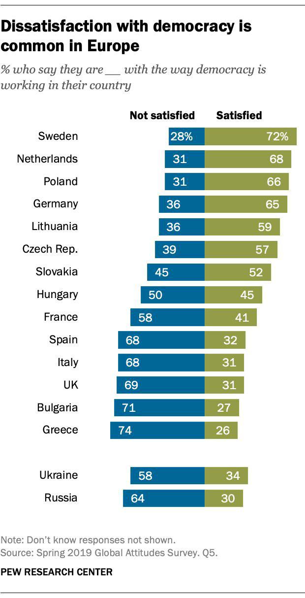 درحالیکه میزان رضایتمندان از عملکرد دموکراسی در بعضی کشورها بالاتر از ناراضیان است و بیش از نیمی از افراد در دسته رضایتمندان هستند (در سوئد، هلند، لهستان، آلمان، لیتوانی، جمهوری چک، اسلواکی)، در بعضی دیگر از کشورها ناراضیان غالباند (در فرانسه، اسپانیا، ایتالیا، بریتانیا، بلغارستان، یونان، اوکراین، روسیه). جالب اینکه ناراضیان از عملکرد دموکراسی در فرانسه و اوکراین برابر است (۵۸% افراد). سوئدیها و هلندیها هم در صدر رضایتمندان از عملکرد دموکراسی در کشورشان هستند.