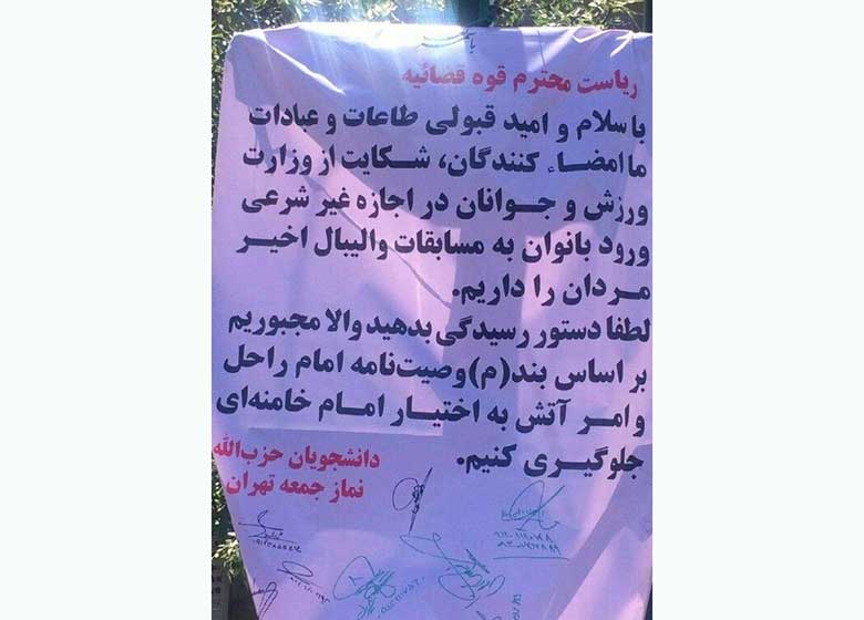 ظهر امروز و در حاشیه نمازجمعه تهران، بنری با متن اعتراض به حضور بانوان در مسابقات والیبال نصب شده و اقدام به جمعآوری امضاء برای اعمال ممنوعیت حضور زنان در ورزشگاهها انجام شد.