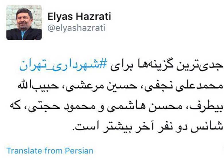 حضرتی طی توییتی نوشت: شانس محسن هاشمی و محمود حجتی، برای شهرداری تهران از بقیه بیشتر است.