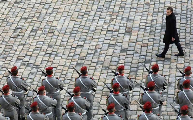 مکرون در حال سان دیدن از گارد آکادمی ملی فرانسه. (ای اف پی)