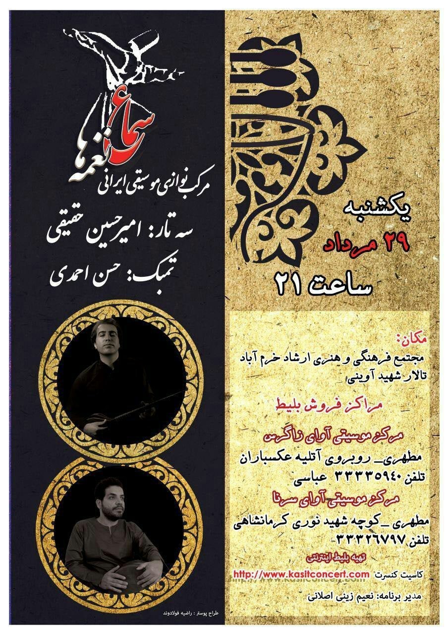 کنسرت «سماع نغمهها» یکشنبه ۲۹ مرداد ۱۳۹۶ ساعت ۲۱:۰۰ در مجتمع فرهنگی و هنری ارشاد خرم آباد-تالار شهید آوینی برگزار میشود.