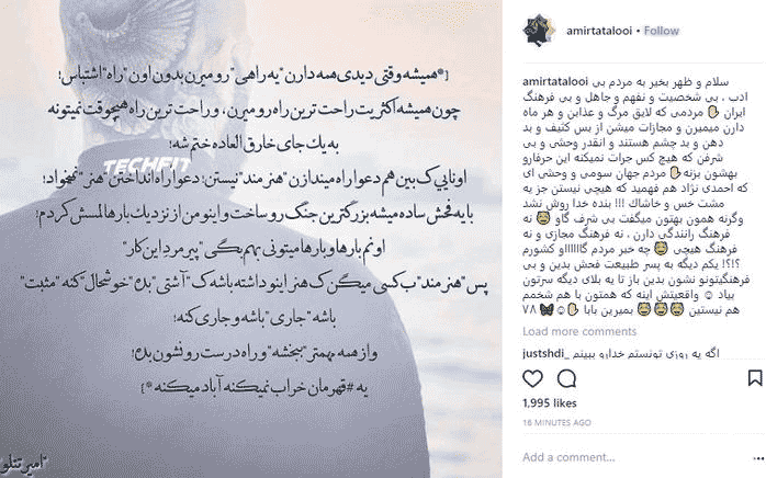 امیر تتلو خواننده پرحاشیه ایرانی که در ایام انتخابات هم به شدت خبر ساز شده بود، بار دیگر با بارگذاری یک پست توهین آمیز و بی سرو ته خبر ساز شده است. معلوم نیست چرا امیر تتلو با سابقه زیاد انتشار این جملات و لغات توهین آمیز و بی ادبانه برخورد نمی شود.