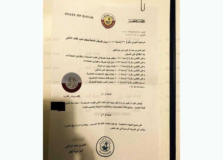 بنا بر این گزارش، طبق سند منتشر شده توسط معارضان دوحه، امیر قطر”طیب أورال أوغلو” ژنرال ترکیهای را به مدت ۶ ماه به عنوان جانشین فرماندهی کل نیروهای ارتش منصوب کرد.
