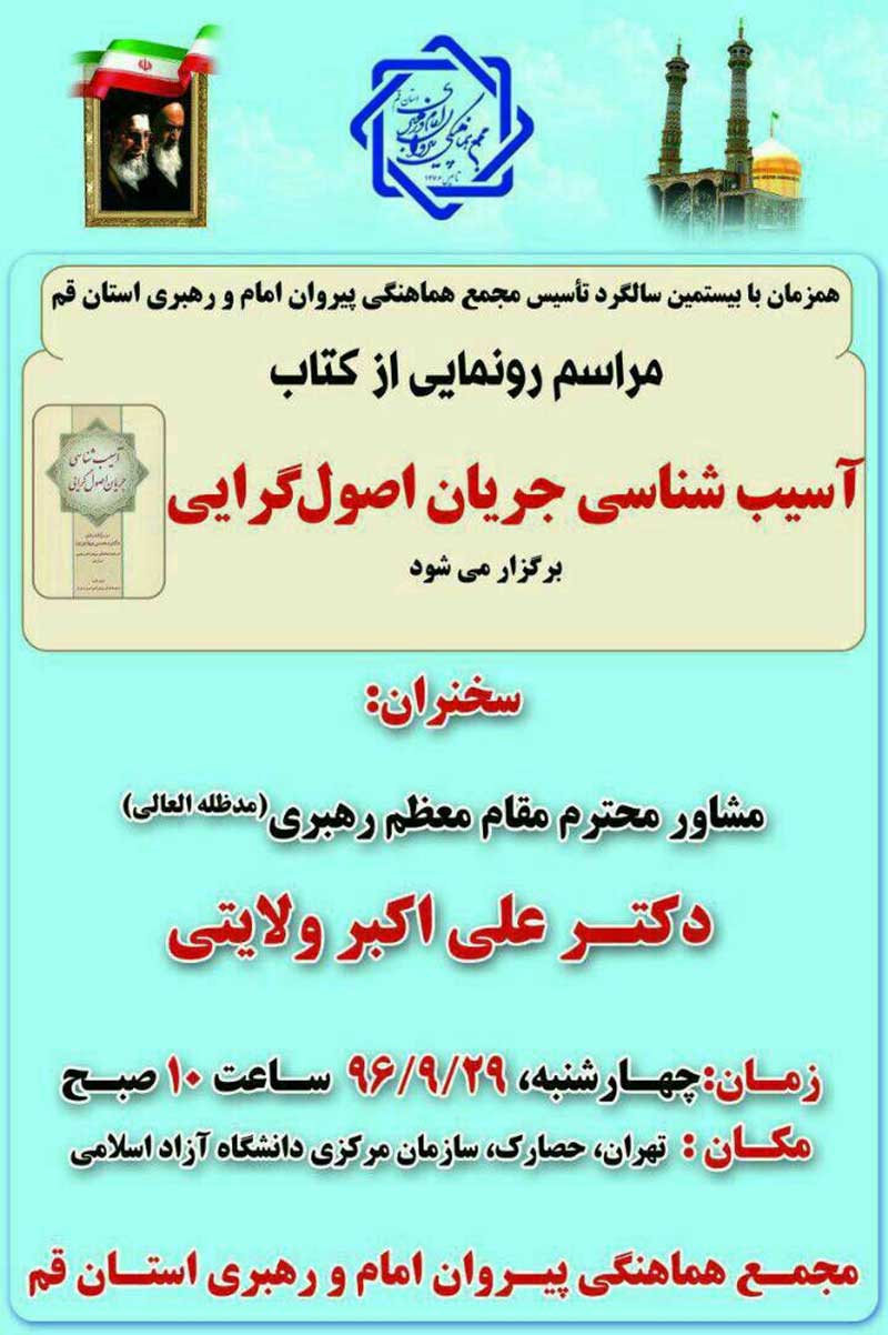 قرار است همزمان با بیستمین سالگرد تاسیس مجمع هماهنگی پیروان خط امام و رهبری استان قم، مراسم رونمایی از کتاب «آسیب شناسی جریان اصولگرایی» در سازمان مرکزی دانشگاه آزاد اسلامی برگزار شود؛ مراسمی که قرار است «علی اکبر ولایتی» در آن سخنرانی کند.