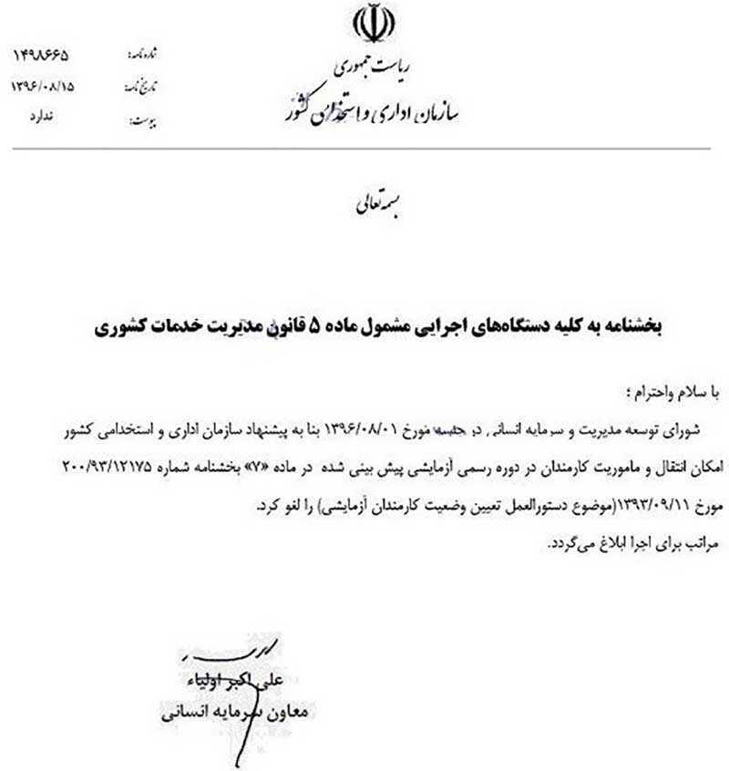 سازمان اداری استخدامی امکان انتقال و ماموریت کارمندان در دوره آزمایشی را لغو کرد.