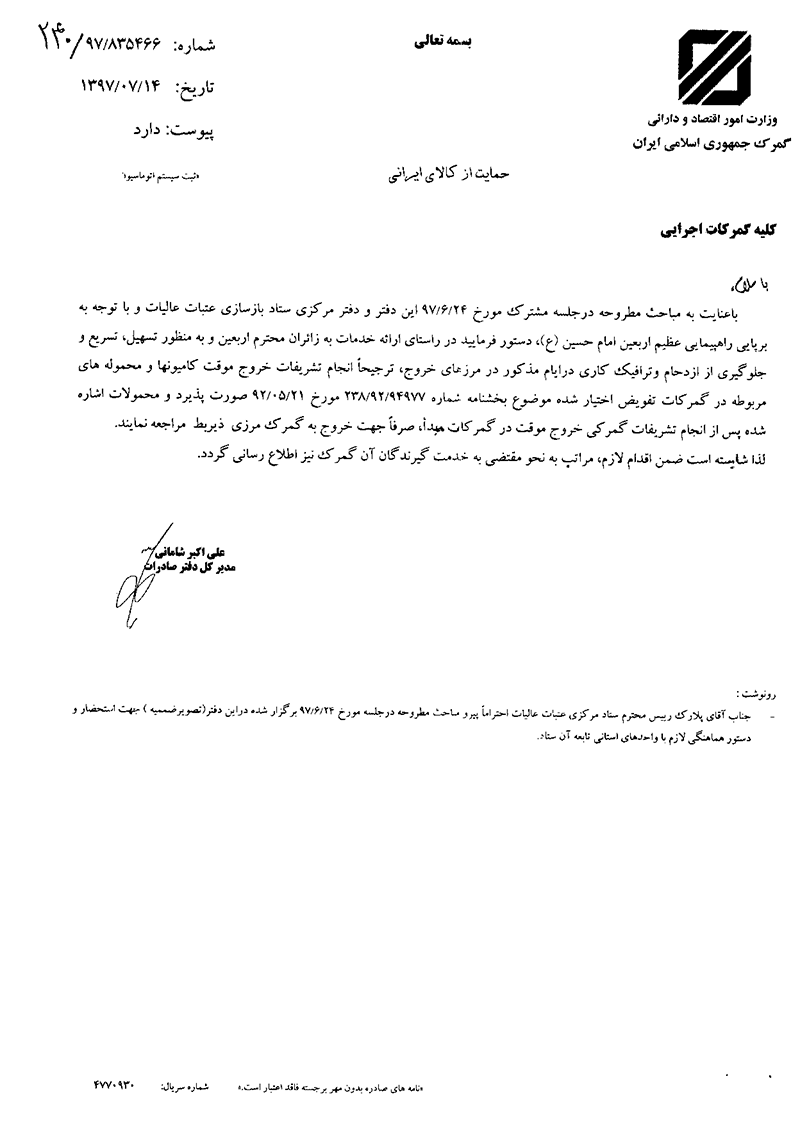 در این بخشنامه آمده است: با عنایت به مباحث مطروحه در جلسه مشترک مورخ ۹۷/۶/۲۴ این دفتر و دفتر مرکزی ستاد بازسازی عتبات عالیات و با توجه به برپایی راهپیمایی عظیم اربعین امام حسین (ع)، دستور فرمایید در راستای ارائه خدمات به زائران محترم اربعین و به منظور تسهیل، تسریع و جلوگیری از ازدحام و ترافیک کاری در ایام مذکور در مرزهای خروج، ترجیحا انجام تشریفات خروج موقت کامیونها و محموله های مربوطه در گمرکات تفویض اختیار شده موضوع بخشنامه شماره ۲۳۸/۹۲/۹۴۹۷۷ مورخ ۹۲/۵/۲۱ صورت پذیرد و محمولات اشاره شده پس از انجام تشریفات گمرکی خروج موقت در گمرکات مبدا، صرفا جهت خروج به گمرک مرزی ذیربط مراجعه نمایند.